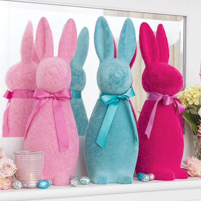 Playfully colorful in shades of pink, blue, and fuchsia, our Bright Lupin Trio sports fuzzy textures and matching ribbons to bring springtime fun to any space. Each bunny measures approximately 5 wide by 16 tall and the set of 3 arrives adorned with a fluffy signature Olive & Cocoa® satin bow.