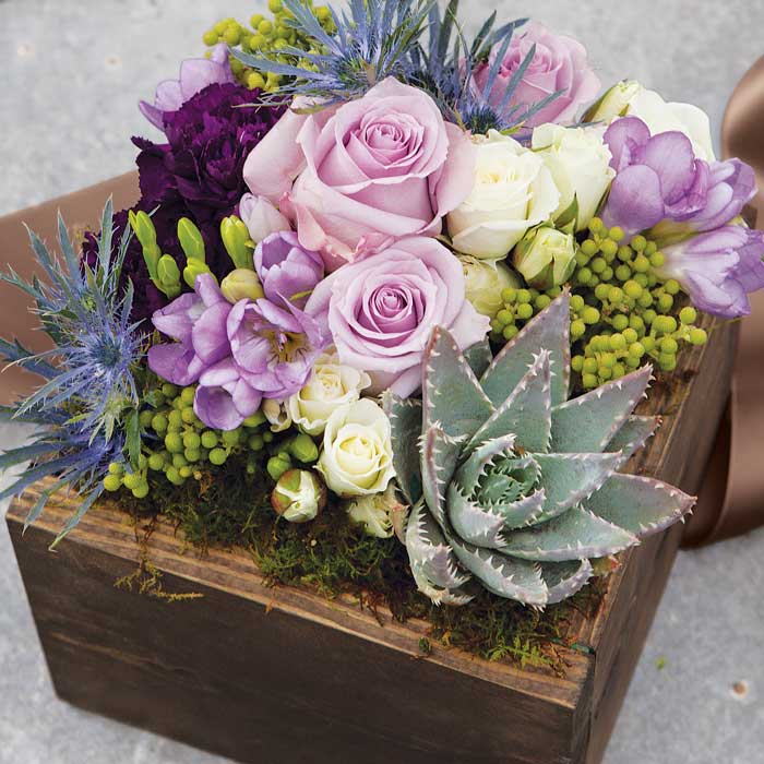 Elevate any occasion with Monique, featuring regal purple blooms and a majestic succulent in a dark stained wooden box. Perfectly gift-wrapped. Order now!
