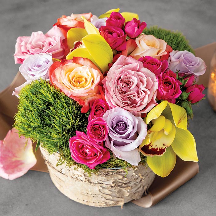 A lush gathering of pastel blooms is arranged in a rustic birch bark potager. Pastel & Birch Fleur measures approximately 7 in diameter by 7 to top of arrangement. Requires next day shipping.