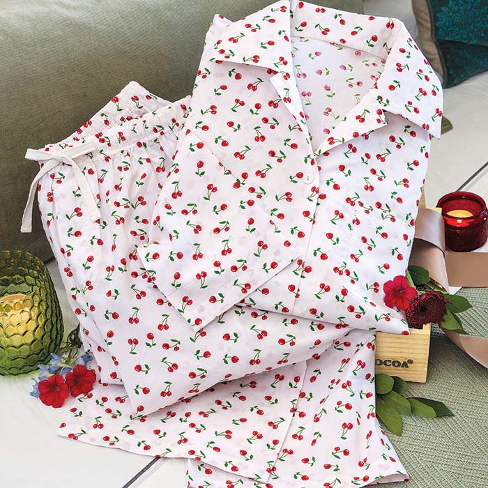 Sweet dreams await! Our Sweet Cherry Pajamas are woven of lightweight cotton and have a long sleeve button front top and elastic drawstring waistband pants. Available in women’s sizes small, medium, large, and extra large, pajamas arrive packaged in a signature Olive & Cocoa® canvas and burlap tote with ribbon.